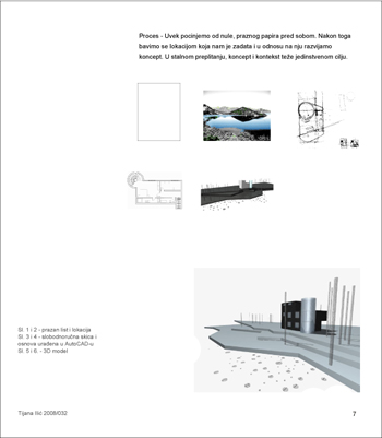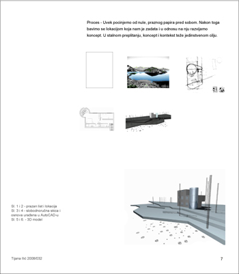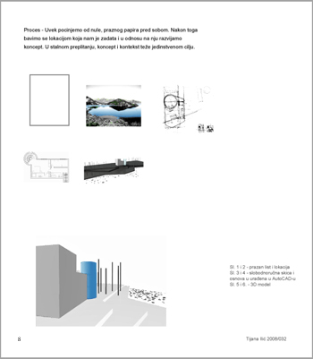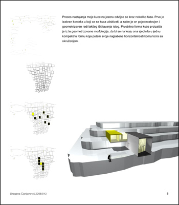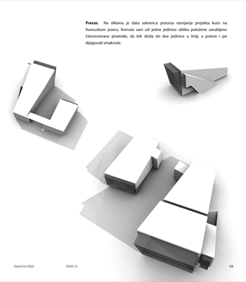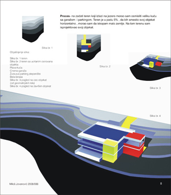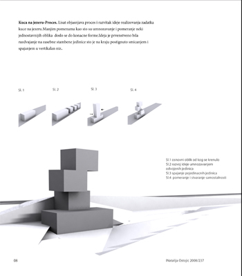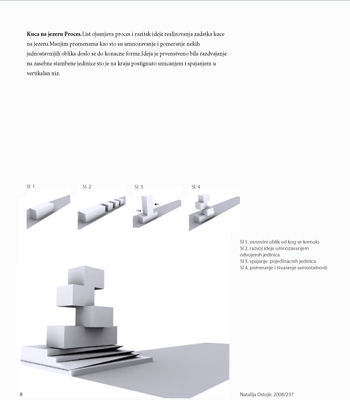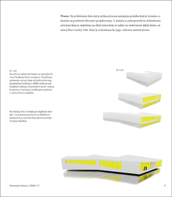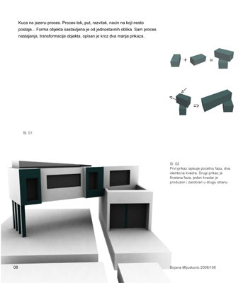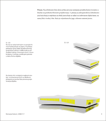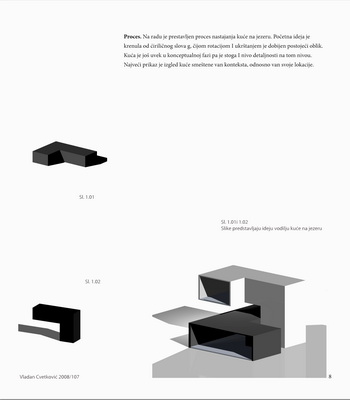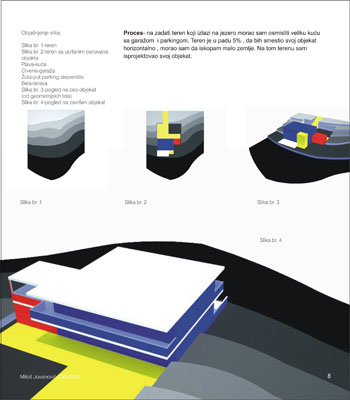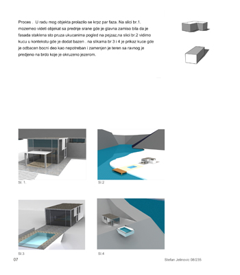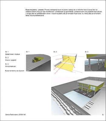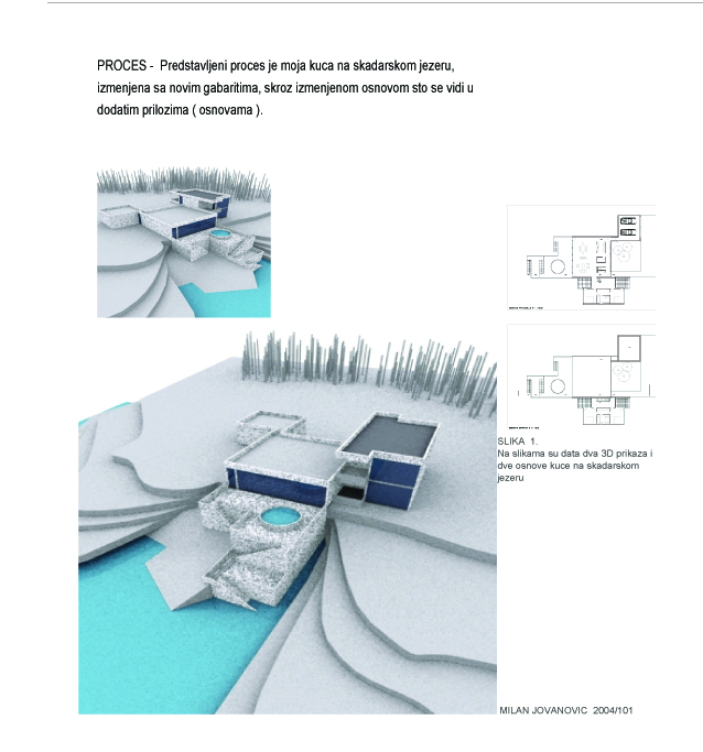 Milose, zasto se u velikom renderu 'ne cita' razigrana forma kuce koju vidimo na drugom i trecem manjem prikazu? I dalje stoji ravna ploca na krovu - mrtva; a pogledaj kako si razigrao lepo formu u manjim prikazima... Ovaj veliki render kao da nije deo price sa sekvenci - koje su zanimljivije... Pokreni formu ka jezeru, neka bude slobodno malo 'razudjenija': to mozes da postignes, a da se ne odaljis od osnovne ideje i ove osnove sa srednjeg manjeg prikaza.