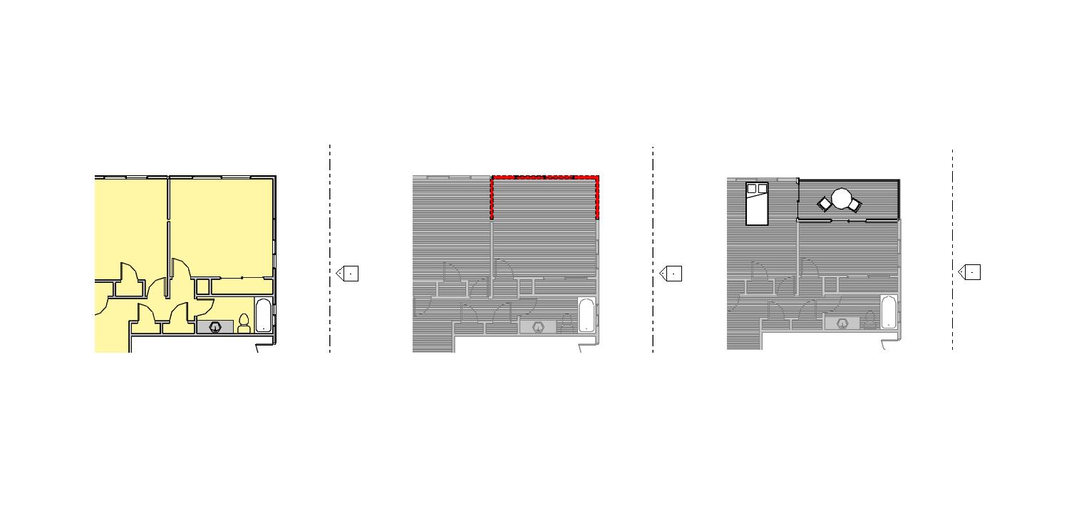 Izmjena postojeceg stanja spavaćeg dijela uvođenjem terase duž cijelog objekta sa opcijama phased renovations, koje omogucavaju tri razlicita istovremena prikaza: existing, demolished i renovation