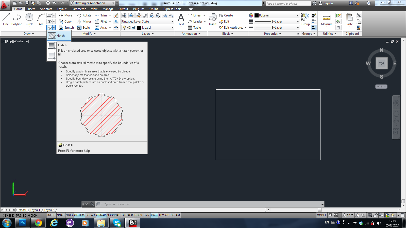 2. Kliknuti na komandu Hatch koja se nalazi uglavnom na paleti na levoj strani ili samo ukucati HATCH