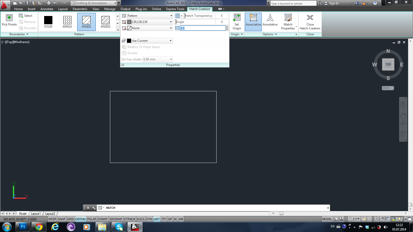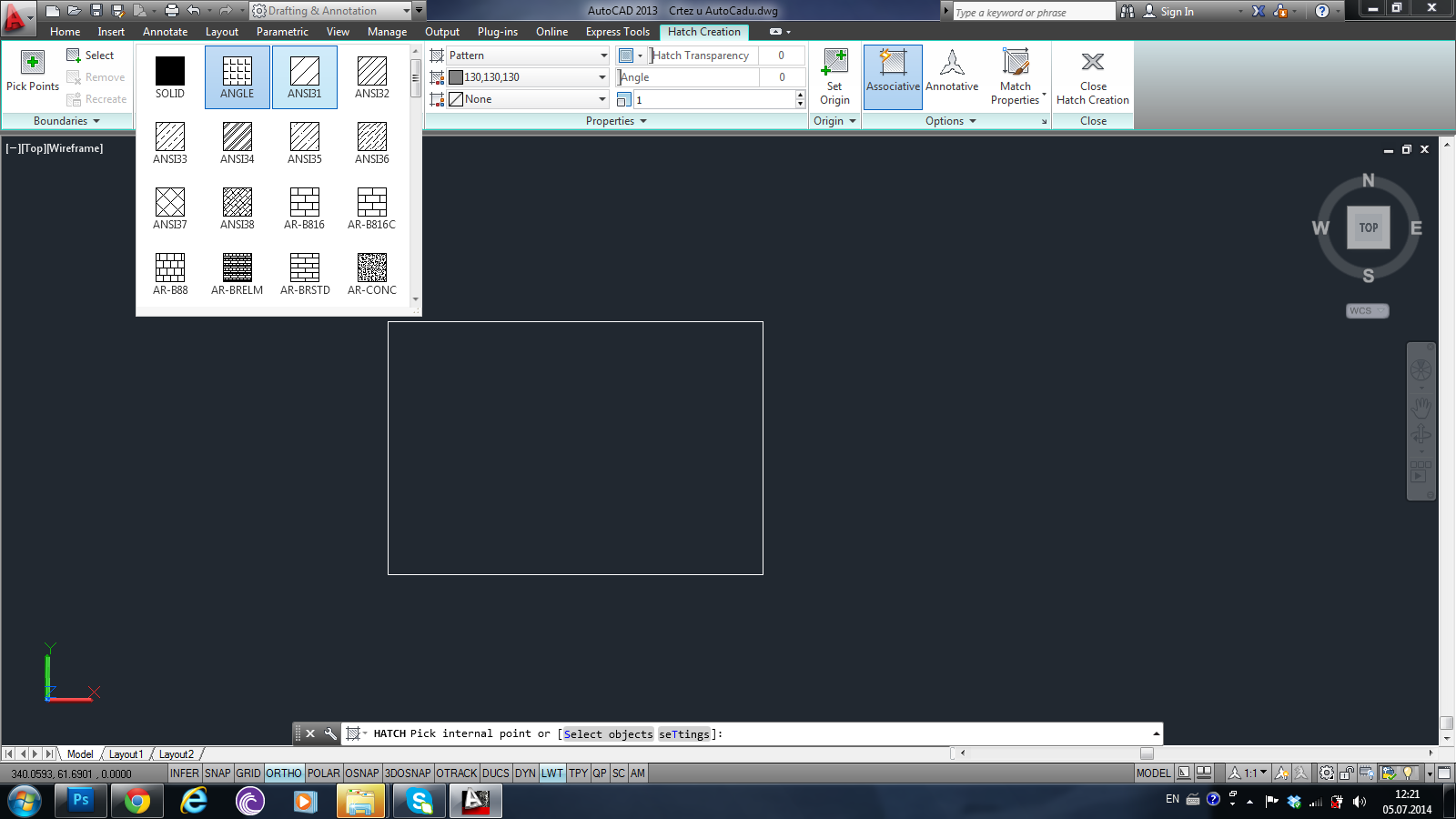 Ako je crtež presek čeličnog dela, možemo izabrati već definisanu šrafuru nazvanu STEEL. Nakon toga moramo kliknuti unutar površine koju hoćemo da šrafiramo i zatim kliknuti ENTER.